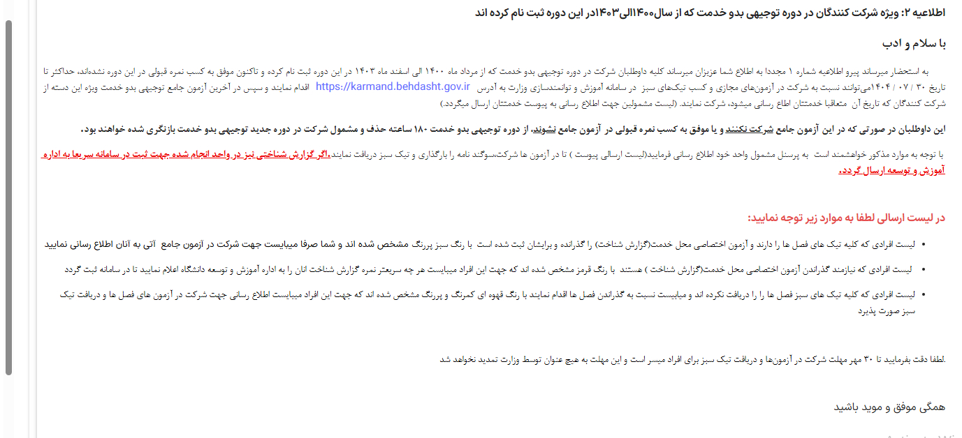 اطلاعیه2:ویژه شرکت کنندگان در دوره توجهی بدو خدمت